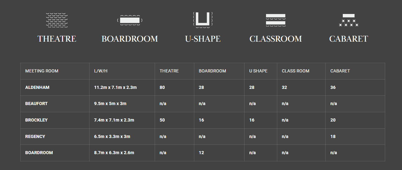 - - from an intimate 12-seat boardroom with private bathroom to the Aldenham suite seating up to 84 in cabaret style.